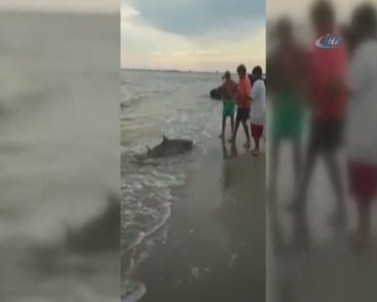 Onlarca kişinin denize girdiği yerde yakalanan hayvan, çevredekilerin meraklı bakışları altında kıyıya çekildi.