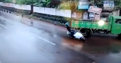 Seyir halinde olan motosikletli, bir anda önüne çıkan kamyonete çarparak yola savruldu. Kazanın şokuyla aracı durdurmadan aşağıya inen kamyonet şoförü ise az daha bir faciaya daha sebebiyet veriyordu.