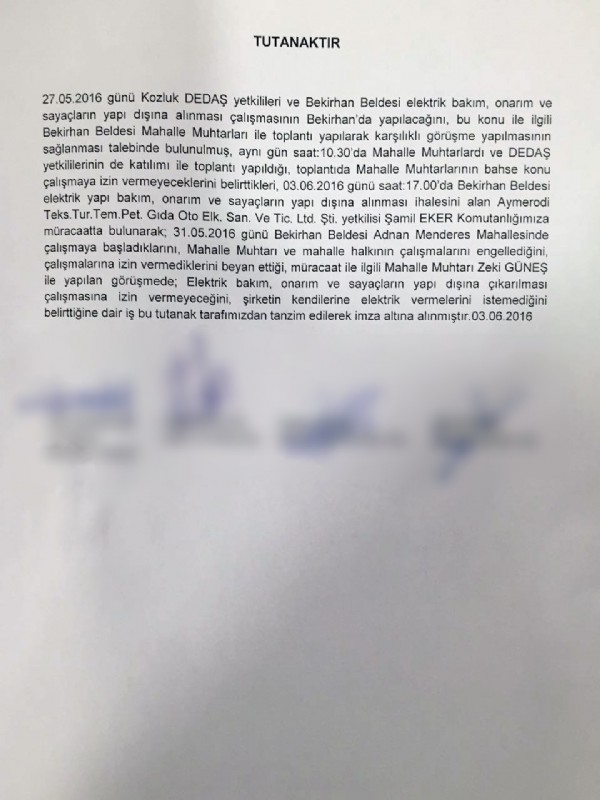Belde sakinlerinin bu talebi jandarmanın yaşananları kayıt altına aldığı resmi tutanaklara da girdi. Söz konusu tutanakta, elektrik sayaçlarının yapı dışına alınması için muhtarlar ve enerji şirketi görevlileri arasında toplantı düzenlendiğine yer verilerek, bu toplantıda mahalle muhtarlarının bahse konu çalışmaya izin vermeyeceklerini belirttikleri kaydedildi. Tutanağın devamında ise, 'Mahalle muhtarı Z.G. ile yapılan görüşmede, elektrik bakım onarım ve sayaçların yapı dışına çıkarılması çalışmasına izin vermeyeceğini, şirketin kendilerine elektrik vermelerini istemediğine dair iş bu tutanak tarafımızdan tanzim edilerek imza altına alınmıştır' ifadeleri yer aldı.