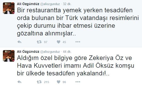 'Aldığım özel bilgiye göre Zekeriya Öz ve Hava Kuvvetleri imamı Adil Öksüz komşu bir ülkede tesadüfen yakalandı!..' diyen Özgündüz, 'Bir restaurantta yemek yerken tesadüfen orda bulunan bir Türk vatandaşı resimlerini çekip durumu ihbar etmesi üzerine gözaltına alınmışlar..' ifadelerini kullandı.
