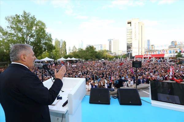 Hareketimizin omurgasını oluşturan teşkilatımız dimdik ayaktadır. Bugün düne göre daha güçlüyüz. İhanetleri, vesayetleri geride bırakmış olarak karşınızdayız. 6-7 Ekim vahşetinden, 17-25 Aralık'a, darbe girişimini bertaraf etmiş darbecilere diz çöktürmüş bir partidir AK Parti. Medyamız, yargımız, polisimiz onurlu bir duruş sergiledi. İhanet çetelerine, terör örgütlerine milletin yoluna taş koyanlara inat biz milletin yoluna baş koyduk. Türkiye'yi daha adil yapacağız. Türkiye'yi vesayet odaklarından, ihanet çetelerinden temizleyeceğiz. Bütün renklerimizle bir olduk, beraber olduk. Milletimizin gazi Meclis'ini bombalayan tüm milleti hedef aldı. AKP, CHP, MHP ve HDP'li vatandaşlarımızla o kanlı darbe girişiminin karşısında dimdik durduk, bir olduk, beraber olduk. Yenikapı mitingi ile taçlanan bu birliği koruyacağız. Yenikapı, aydınlık Türkiye'nin yeni kapısı olmuştur.