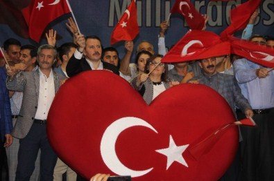 Ali Yalçın’a Gaziantep Büyükşehir belediye Başkanı Fatma Şahin tarafından Arapça ’elif’ harfinin tablosu hediye edildi. Ganel Başkan Yalçın, Büyükşehir Belediye Başkanı Fatma Şahin, AK Parti İl Başkanı Eyüp Özkeçeci, Şahinbey Belediye Başkanı Mehmet Tahmazoğlu, Gaziantep Sanayi Odası Başkanı Adil konukoğlu ve Gaziantep Ticaret Odası Başkanı Eyüp Bartık, bazı sivil toplum kuruluşlarının temsilcileri ile birlikte platforma çıkarak, çalınan marş ve kahramanlık türkülerine eşlik etti. Platformdaki protokol ellerindeki Türk bayraklarını sallayarak, alandakilerle birlikte büyük coşku yaşadı.