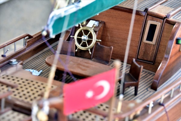 'İki metrelik tekneye sipariş üzerine başladım. Maketin yapımı yaklaşık 3 ay sürdü. Teknenin yapımında kontrplak, tik ağacı, maun ağacı kullandım. İnce detaylara değindim. Ölçüleri olması gerektiği gibi ayarladım. 30 metrelik bir tekne nasılsa, maketini de aynı şekilde yaptım.'