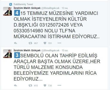 “Ankara Büyükşehir Belediyesi olarak 15 Temmuz darbe girişimine ait Türkiye’nin en büyük ‘15 Temmuz Müzesi’ çalışmalarına başlanmıştır. Bu konuda tüm 15 Temmuz şehit ve gazi ailelerinin yardımına ihtiyacımız vardır. Vatandaşlarımızdan, müzede 15 Temmuz gecesinin sembolü olan tahrip edilmiş araçlar başta olmak üzere, her türlü malzeme konusunda Belediyemize yardımlarını rica ediyoruz.”