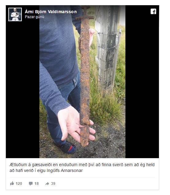 Kılıcı bulan Arni Björn Valdimarsson, 'Kaz avlamaya geldik, ama Viking kılıcı bulduk' notuyla kılıcın fotoğrafını paylaştı.