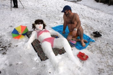 Bursa’da geçen sene kardan yaptığı gelinle sosyal meydana tıklanma rekorları kıran vatandaş, bu yıl da kardan eşiyle balayına çıkıp güneşlendi. Plaj havlusunu sererek yanına uzandığı bikinili kardan geline güneş kremi süren genç adam, herkesi kahkahaya boğdu.