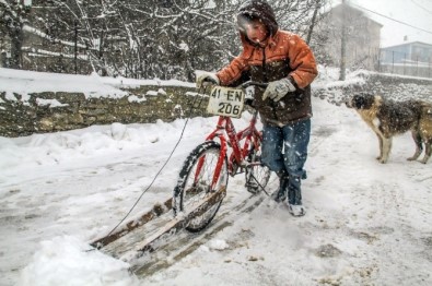 Kocaeli’de genelinde etkili olan kar yağışı sonrası kapanan yollara çözüm arayan 9 yaşındaki Mesut Uzun, icat ettiği bıçaklı kar bisikleti ile yolları açan ekiplere destek veriyor.