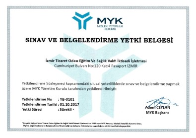 İzmir Ticaret Odası (İTO) ve İzmir Ticaret Odası Eğitim ve Sağlık Vakfı Yönetim Kurulu Başkanı Ekrem Demirtaş, mesleki yeterlilik belgesi vermek için yaptıkları çalışmalar sonucunda İzmir Ticaret Odası Eğitim ve Sağlık Vakfı İktisadi İşletmesi’nin yetkilendirilmiş belgelendirme kuruluşu olduğunu açıkladı.