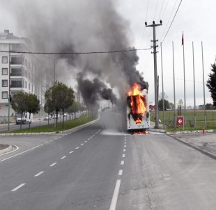 Tekirdağ’ın Çerkezköy ilçesinde işçi servisi, seyir halindeyken alev aldı. İşçilerin yangından birkaç dakika önce araçtan inmesi olası bir facianın önüne geçerken alevler arasında kalan minibüsü itfaiye ekipleri söndürdü.