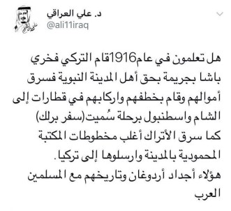 Cumhurbaşkanlığı Sözcüsü İbrahim Kalın, paylaşılan tweete tepki vermekte gecikmedi. Kalın, attığı tweette, "Birleşik Arap Emirlikleri Dışişleri Bakanı Zayed’in Türklerle Arapları yeniden karşı karşıya getirmek isteyen yalanlarla dolu propagandayı yayınlaması bir utançtır. Fahreddin Paşa, İngiliz planlarına karşı Medine’yi cesurca savundu. Ne pahasına olursa olsun Cumhurbaşkanı Erdoğan’a saldırmak yeni moda mı?" ifadelerine yer verdi.
