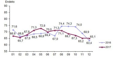 Buna göre; Türkiye İstatistik Kurumu ve Türkiye Cumhuriyet Merkez Bankası işbirliği ile yürütülen tüketici eğilim anketi sonuçlarından hesaplanan tüketici güven endeksi, Aralık ayında bir önceki aya göre yüzde 0,1 oranında azaldı; Kasım ayında 65,2 olan endeks Aralık ayında 65,1 oldu.