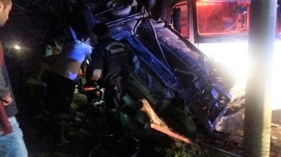 ticari araç çarpıştı. Hafif ticari araçta bulunan Hüseyin Sülün ve yanında bulunan Burak Gardaş, hurdaya dönen araçta sıkıştı.