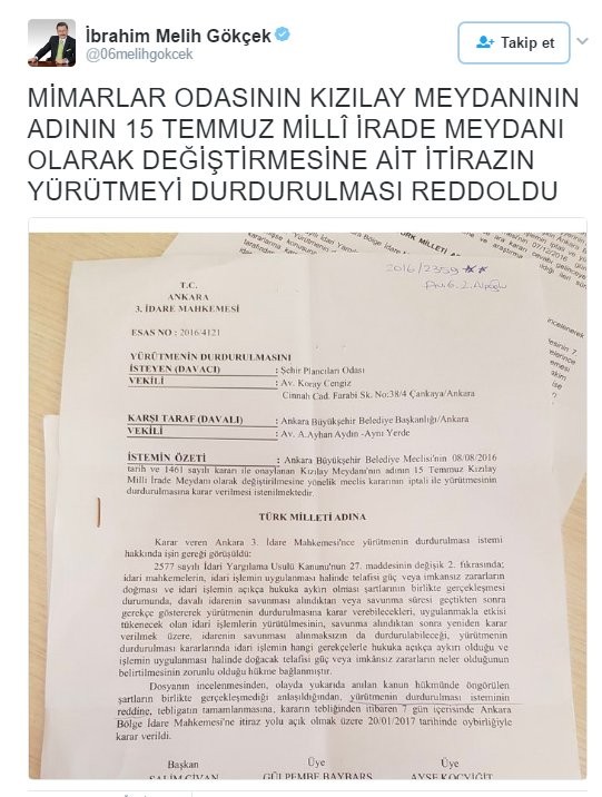 Mimarlar Odası'nın, Kızılay Meydanı'nın adının değiştirilmesinin ardından yaptığı itiraz mahkeme tarafından reddedildi..