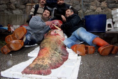 Yere yatırılan balığın yanına uzanan vatandaşlar bu şekilde de hatıra fotoğrafı çektirmeyi unutmadı. Bir insan boyundan uzun olan balık kısa sürede tükendi.