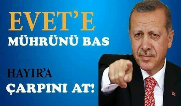 Dolaşıma sokulan Cumhurbaşkanı Recep Tayyip Erdoğan'a ait bir fotoğrafın altına 'Evet'e mühürünü bas, hayıra çarpını at' yazısını ekleyen hayır cephesi, vatandaşlara 16 Nisan'da sandığa kalemle gelmeleri çağrısını yapıyor.