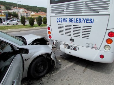 İzmir’in Çeşme ilçesinde, öğrencileri bekleyen belediye otobüsüne bir otomobilin çarpması sonucu 3 kişi yaralandı.