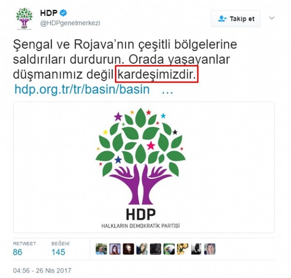 Yapılan açıklamada; yerleşim yeri olmadığı bilinen bölgelerde Ezidi ve Türkmenler'in yaşadığını iddia ederek terör örgütlerinin vurulmasından duydukları rahatsızlığı açıkça 'kardeşimizdir' şeklinde savundu.