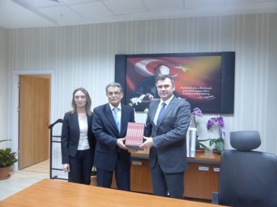 NEÜ Rektör Yardımcıları Çiçek ve Karipcin eski Bakan Prof. Dr. Sami Güçlü’ye üniversite hakkında bilgi vererek Nevşehir’i ve üniversiteyi tanıtan yazılı eser ve hediye takdiminde bulundular.