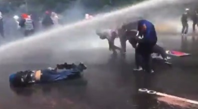 aracından sıkılan tazyikli su, göstericilerden bazılarını metrelerce savurdu. O anlar