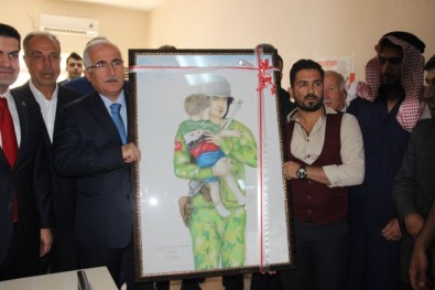 Suriye’deki iç savaştan kaçarak Şanlıurfa’nın Ceylanpınar ilçesine sığınan Suriyeli Ressam İbrahim Dehlil, çizdiği Türk askerinin Suriyeli bir çocuğu kucakladığı tabloyu Vali Güngöz Azim Tuna’ya hediye etti.