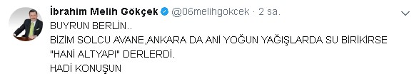 Gökçek; Buyrun Berlin... Bizim solcu avane, Ankara'da ani yoğun yağışlarda su birikirse 'hani altyapı' derlerdi. Hadi konuşun' yazdı.