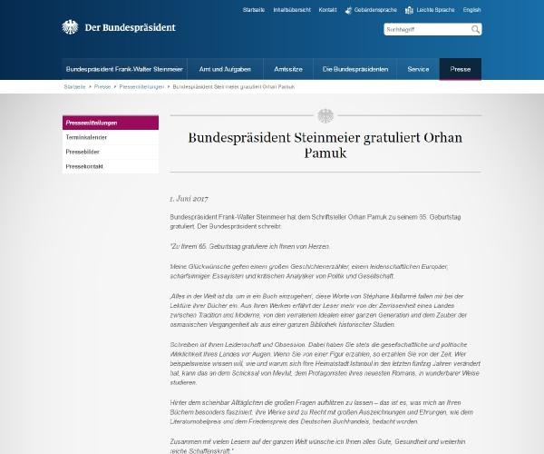 Almanya Cumhurbaşkanı Frank-Walter Steinmeier, Orhan Pamuk'un doğum günü dolayısıyla kamuya açık bir kutlama mesaj yayımladı.