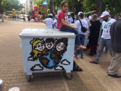Suriyeli mülteciler Gaziantep Kent Konseyi üyeleri ile birlikte çevreye dikkat çekmek amacıyla çöp konteynerlerini boyayıp, parkı temizledi.