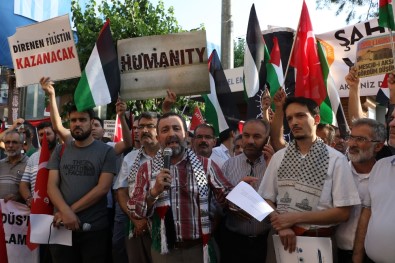 ‘Katil İsrail’, ’Filistin’e özgürlük’, ’Mescid-i Aksa’ya uzanan eller kırılsın’, ’Direnen
