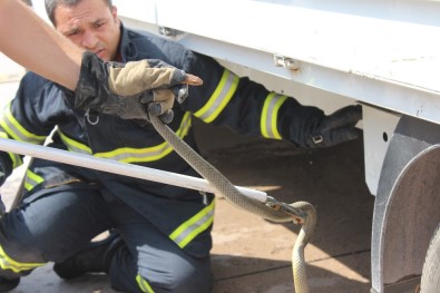 İtfaiye ekiplerinin kamyonetin altından çıkardığı yılan, boş bir karton kutuya alınarak doğaya salınmak üzere itfaiye ekiplerince götürüldü.