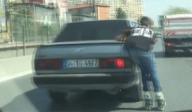 İstanbul’da akan trafikte bir araca tutunarak seyreden patenli genç yürekleri ağızlara getirdi.
