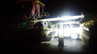 yol çalışması nedeniyle trafiğe kapalı yoldaki Karayollarına ait Asfalt Serme Makinesi Finişere arkadan çarptı. Kaza sonrası çarpmanın etkisi ile otomobil alev topuna dönerken, yanan otomobili ise ihbar üzerine olay gelen