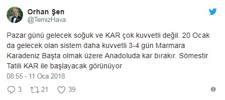 'Pazar günü gelecek soğuk ve KAR çok kuvvetli değil. 20 Ocak da gelecek olan sistem daha kuvvetli 3-4 gün Marmara Karadeniz Başta olmak üzere Anadoluda kar bırakır. Sömestir Tatili KAR ile başlayacak görünüyor'