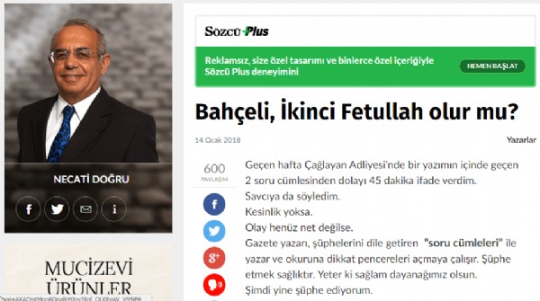 Sözcü Yazarı Necati Doğru'nun dün kaleme aldığı 'Bahçeli, İkinci Fetullah olur mu?' başlıklı köşe yazısı büyük tepki çekti.