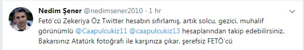 Zekeriya Öz'ün değişik profillerle ortaya çıkabileceğini yazan Şener 'Fetö'cü Zekeriya Öz Twitter hesabın sıfırlamış, artık solcu, gezici, muhalif görünümlü @Caapulcukiz11 @caapulcukiz13 hesaplarından takip edebilirsiniz. Bakarsınız Atatürk fotoğrafı ile karşınıza çıkar, şerefsiz FETÖ'cü' ifadelerini kullandı.
