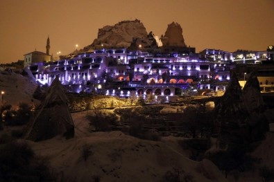 Türkiye’nin önemli turizm merkezlerinden olan Kapadokya bölgesinde karla kaplı peribacaları geceyle birlikte kartpostallık görüntüler oluşturdu.