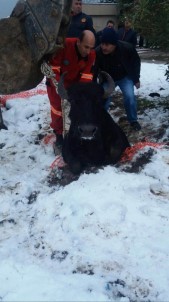 büyükbaş hayvan, görenleri hayrete düşürdü. Yüzlerce kilo ağırlığında olan ve saatlerce sulama kanalında mahsur kalan