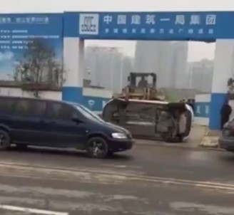 Çin’de bir inşaat sahasının önüne çekilen otomobil, iş makinesinin gazabına uğradı.