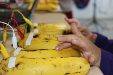 İletkenliği olan tüm meyvelerden ses çıkartabildiklerini belirten Bahçelievler İTO Bilim ve Sanat Merkezi’nde müzik öğretmenliği yapan Elçin Değer Biricik, "Dünyada eğitim sisteminde STEM diye bir uygulama başlatıldı. Bu fen matematik ve aynı zamanda sanatı da içine alan bir eğitim sistemi çok yönlü bir sistem. Bugün çocuklarımızla teknolojik bir arayüz kartını kullanarak muzları bu karta bağlayarak ve bilgisayar üzerinden muzlarla piyano atölyesini yaptık. Çocuklarımızın ilgisinden çok memnunum. Olumlu olumsuz görüşlerini soruyoruz çocuklarımıza şimdiye kadar hiç olumsuz bir dönüş almadık. Hepsi çok heyecanlılar. Çocuklara soruyorum ’muzdan ses çıkar mı?’ diye, yüzde 99 hayır diyor, ama sonradan çıktığını gördükleri zaman gerçekten çok şaşırıyorlar ve seviniyorlar" dedi.