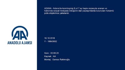 Adana'da hakkındaki 8 yıl 7 ay kesinleşmiş hapis cezası nedeniyle aranan hükümlü polis ekiplerince yakalandı Hükümlünün, yakalanmamak için arkadaşlarına sosyal medyada başı, kolu, göğsü sargı beziyle sarılı ve altında 'Rabbim mekanını cennet eylesin. Allah ailesine sabır versin. Ruhu şad olsun' yorumu bulunan fotoğraf paylaştırdığı belirlendi