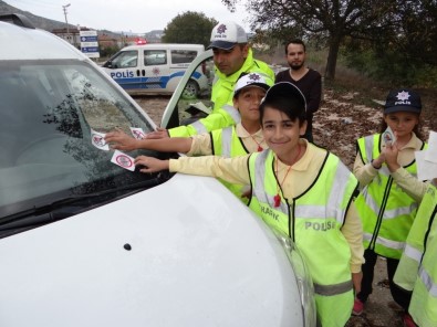 Minik polisler araçlara ‘sticker’ yapıştırarak sürücüleri trafik kurallarına uymaları için uyarılarda bulundu.