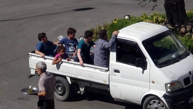 Kilis’te, küçük kamyonetin arkasına binen Suriyeli aile tehlikeli piknik yolculuğu görüntülendi.