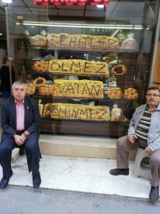 ‘Şehitler ölmez vatan bölünmez’ sloganını hazırladığı ekmek üzerine yazıp dükkanının vitrinine asan Erkan Kardeşler Ekmek Fırını sahibi Necdet Erkan ve Tarık Erkan, "Geçtiğimiz günlerde Batman’ın Gercüş ilçesinde yaşanan hain terör saldırısı sonucunda şehit olan 8 vatan evladımıza Rabbimden rahmet diliyorum. Yaralılarımıza da acil şifalar diliyorum. Hainler bugüne kadar yaptıkları gibi haince kalleşçe saldırılarını tekrar yapıyorlar. Hükümetimizin terörü bitirme noktasında attığı kararlı adımların devam edeceğine olan inancımız tamdır. Hainler bugüne kadar olduğu gibi bugünden sonra da emellerine ulaşamayacaklar. Biz de esnaf olarak terörü lanetliyoruz” dedi.