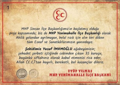 MHP İlçe Başkanı Eyüp Yılmaz, Yenimahalle’de ses getiren etkinlikle ilgili olarak, "MHP Yenimahalle İlçe Teşkilatı olarak proje kapsamında akşamdan başlayarak adım adım 13 bin esnafımızın kapısına hazırladığımız MHP Yenimahalle İlçe Başkanlığı olarak Ahilik yolundan ayrılmayan, helal rızık için alın teri döken tüm esnaf ve sanatkarlarımızın yanındayız. Şehidimiz Yusuf İmamoğlu ağabeyimizin şehadet şerbeti içtiğinde cebinden çıkan 35 kuruşu, bugünkü siftahınız olarak kabul etmenizi rica eder, Allah’tan hayırlı ve bereketli bol kazançlar dileriz’ yazılı belgeyi tek tek dağıttık. Bu anlamlı kampanyada sabaha kadar yorulmadan katkı yapan tüm teşkilat mensuplarımıza teşekkür ediyorum" ifadelerini kullandı.