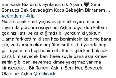 Katılmış, sosyal medya hesabından da yine çok duygusal mesajlar paylaştı. Cem Demir ile birlikte olduğu fotoğrafları paylaşan Katılmış, "Biz birdik ayrılmazdık, aşkım, seni sonsuza dek seveceğim. Nasıl olacak nasıl yaşayacağım bilmiyorum seni rüyamda gördüm. ’Üşüyorum aşkım’ diyordun kalbim çok hızlı attı ve kalktığımda biliyordum ki yoktun. Ama farkettim ki sen hep benimlesin kalbime bana güç veriyorsun. Rüyama hep gir, rüyalarımda hep benim ol. Senin gibi kim bakacak bana kim sevecek beni söyle. Bana asla kimse senin gibi bakamaz, beni kimse senin gibi sevemez kimse yakışmaz yanıma kimse. Birtanem aşkım seni hep sevecek olan kek aşkın. Sensiz olmuyor aşkım. Ne olur gel ölüyorum" notlarını düştü. Bu notları okuyan birçok takipçisinin üzüntülerini dile getiren yorumlar yaptığı görüldü.