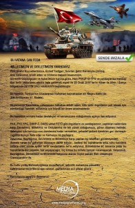 Zeytin Dalı Harekatına destek olmak için imza kampanyası başlattı. “Mehmetçik’in yanındayız” adı altında başlatılan imza kampanyasına platform üyeleri yoğun ilgi gösteriyor. Yapılan açıklama ile kamuoyuna imza kampanyası duyurulurken, kampanya metninde, "Türk Silahlı Kuvvetlerimizce, ecdad yadigarı, sınırları