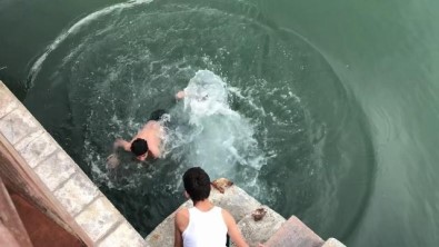 Düzce’nin Akçakoca ilçesinde iki genç, soğuk havaya rağmen denize girdiler. İskeleden denize atlayan gençleri görenler ise şaşkınlıklarını gizleyemedi.