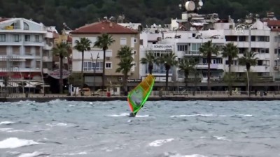 Hava sıcaklığının 18, deniz suyu sıcaklığının 19 derece ölçüldüğü Marmaris'te hızı saatte 60 kilometreyi bulan lodos, adrenalin tutkunlarını mutlu etti.