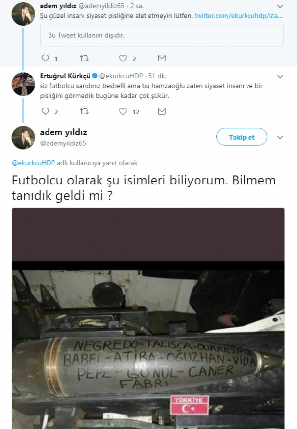 Afrin'de YPG'ye karşı kullanılan Beşiktaşlı futbolcuların isimleri yazılı füze'nin fotoğrafını paylaşan takipçisi 'Futbolcu olarak şu isimleri biliyorum. Bilmem tanıdık geldi mi ?' diye yazdı.