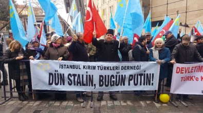Rusya’nın Kırım’ı ilhakının 4. yıl dönümünde İstanbul’da toplanan Kırım Tatarları, Rusya’yı protesto etti, konsolosluk önüne siyah çelenk bıraktı.
