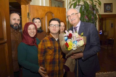 Başkan Yılmaz kendisini ziyarete gelenler arasında yer alan down sendromlu Ahmet ile yakından ilgilendi.